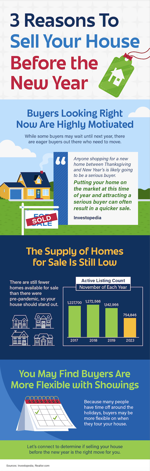 - Buyers looking right now are highly motivated, the supply of homes for sale is still low, and you may find buyers are more flexible with showings this time of year.